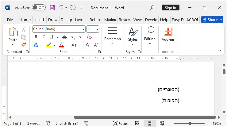 לדוגמה: בקובץ וורד חדש נכתוב שתי מילים עם סוגריים הפוכות.