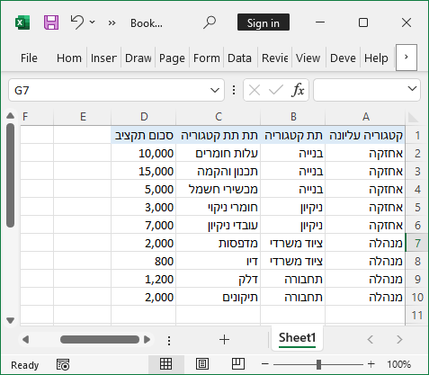 שלב 1 - יצירת טבלת תקציב באקסל - נבנה טבלת תקציב הכוללת את העמודות: קטגוריה עליונה, תת קטגוריה, תת תת קטגוריה וסכום תקציב.