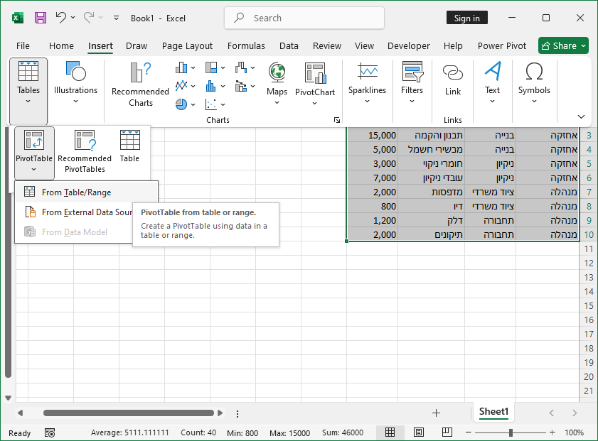 נבחר בתפריט הוספה -> טבלת ציר Power Pivot -> מטבלה / אזור