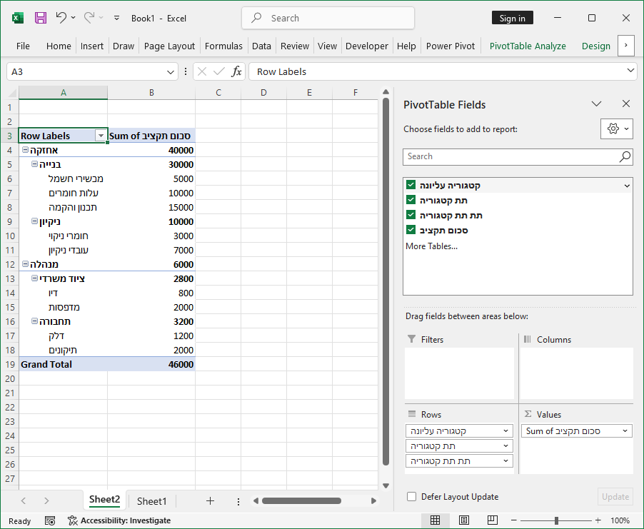 שלב 3 - הגדרת טבלת תקציב לפי קטגוריות ותת קטגוריות בטבלת הפיבוט -