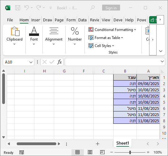 נגדיר בגיליון אקסל טבלת נתונים עם עמודת תאריך ושם עובד.