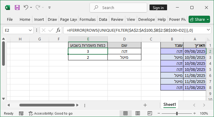 התוצאה - בעמודה E נקבל את מספר המשמרות בהם העובד עבד השבוע (0 עד 7) ללא ספירה כפולה במקרים שעובד מופיע יותר מפעם אחת ביום.