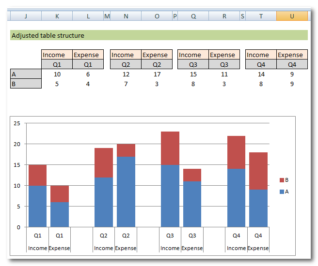 אני מחפש פתרון לגרף שיציג בערמות מוערמות הכנסות והוצאות לכל רבעון, כך שתהיה לי לכל רבעון עמודה אחת של הכנסות ולידה עמודה אחת של הוצאות, אבל מצד שני BAR ההכנסות יהיה מורכב מערמה כוללת של הכנסות א והכנסות ב' (באותו טוראך מובחן האחד מהשני) שהם ביחד כלל ההכנסות.