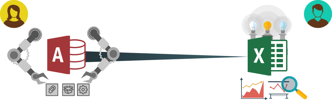 דוגמא קלאסית לשילוב מתבקש בין אקסס ואקסל מתרחשת במסגרת ארגון שיש בו תהליך עסקי שאינו נתמך על ידי מערכות מידע קיימות. למשל, ארגון אשר מספק שירותי תיקונים והתקנות של מכונות אצל הלקוחות נדרש לנהל את התהליך של השירות לאורך ולרוחב. במקרים רבים, מערכת ERP או CRM הקיימת בארגון לא תומכות בתהליך הייחודי שהתפתח עם השנים בחברה. תהליך כזה לרוב מכיל מורכבויות רבות החל מתזמון מהנדסים וטכנאים, דרך אספקה חלקים ועד ניהול נתונים פיננסיים הכרוכים בתהליך. אחת החלופות היותר הזמינות לטפל בסוגיה המתוארת, הינה בעזרת אקסס כמבנה נתונים וטרנזקציות (זרימת הנתונים, איסופם וסיווגם) ואקסל כמנוע לניתוח והצגת נתונים. כל תוכנה תהיה אחראית על נדבך אחר בתהליך המלא. באותה העת, יפעלו היישומים כמקשה אחת למילוי צרכי התהליך. אם כן, האקסס יהיה אחראי על ממשקי איסוף הנתונים, כגון סוגי תקלות ,תאריכי תיקונים, שמות והסמכות של מהנדסי שירות וטכנאים, משך הטיפול בתקלה או בהתקנה ועוד. האקסל ישמש קצה לניתוח הנתונים, כאשר האנליסט יוכל לייצא את הנתונים שנצברו במבנה הנתונים של אקסס בלחיצת כפתור. הנתונים ייקלטו במודל המבוסס אקסל ויעברו את החישובים הדרושים, כגון משך טיפול ממוצע, סוגי תקלות נפוצות וכדומה. הנתונים יסודרו בתבניות שהוגדרו מראש ויציגו את המדדים בצורה ויזואילית.