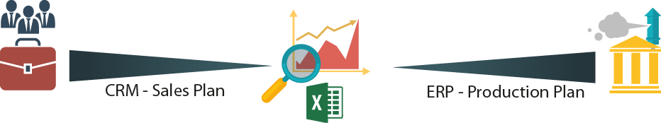 דוגמא אופיינית לאפשרות של הפעלת אקסל ככלי מגשר בין מערכות מתמקדת בצורך של השוואת תכנית ייצור לתכנית מכירות לפי לקוחות. ברור, כי קיים קשר ישיר בין תכנית ייצור לתכנית מכירות כאשר מתודולוגיות ייצור שונות מציעות מודלים שונים לתכנון. אחד האספקטים שיש למדוד הוא כמות הזמנות צפויה על בסיס היסטורי מול תכנית ייצור כפי שתוכננה לשנה או לרבעון. בעסק דינאמי השוואה כזו נדרשת אחת לשבוע ומסתמכת על פלטים ממערכת CRM ומערכת ERP, כאשר אין ממשק או דוח ייחודי העונה לצורך המתואר. במצב כזה אנליסט יבצע את הניתוח לרוב באקסל כאשר רמת היעילות של עבודתו תלויה במידה רבה ברמת שליטתו ביכולות אקסל.