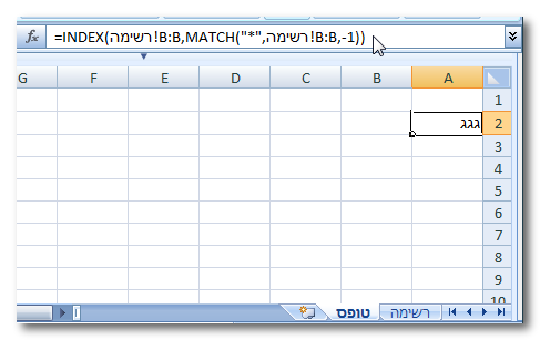 =INDEX(רשימה!B:B,MATCH("*",רשימה!B:B,-1))