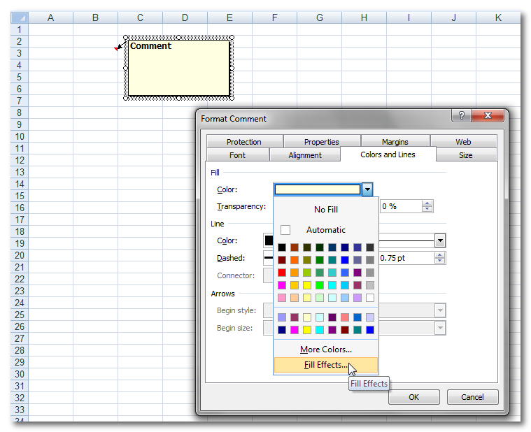 שלב 2: בתפריט עריכת הערה, בחירה בלשונית צבעים וקווים, וכניסה לאפקטים של מילוי: