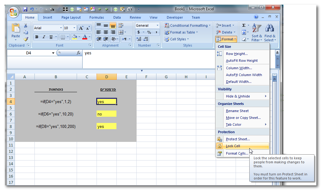 עומדים על תא D4, בתפריט הבית בפורמט לוחצים על "נעילת תא", כך שהמנעול יהיה ללא רקע סביבו. אותו תהליך רלוונטי לכל שאר התאים שרוצים לאפשר גישה אליהם (כאן D6 ו-D8 בנוסף ל-D4)