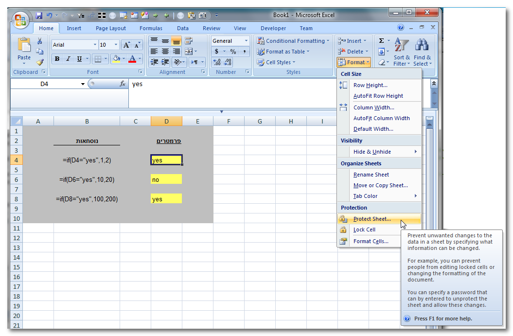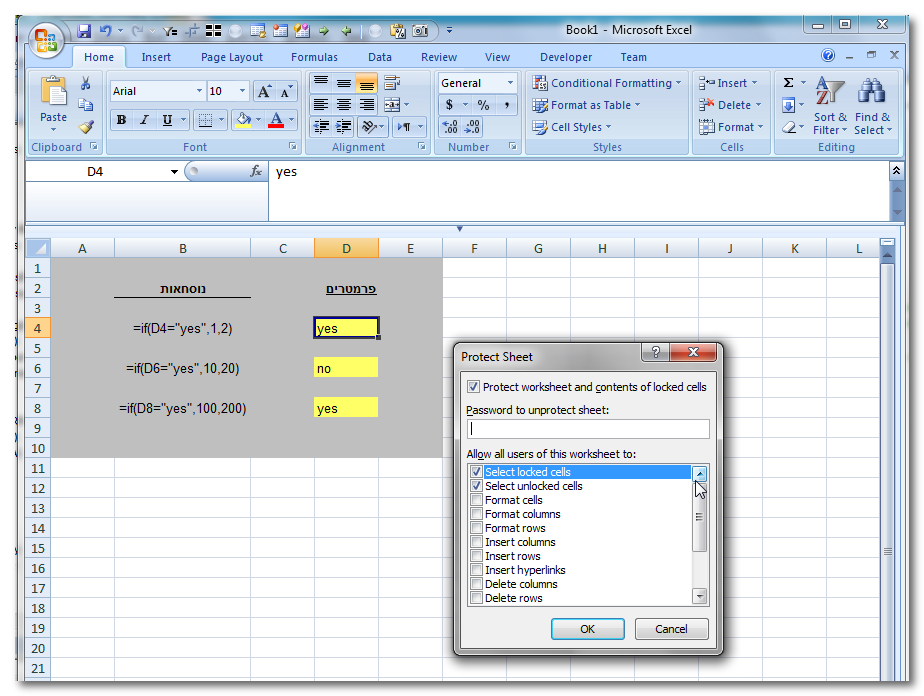 בגיליון אקסל המכיל מספר תאי פרמטרים ומספר תאי נוסחאות, קיים צורך לנעול את תאי הנוסחאות (כדי לא לאפשר שינוי) ולהשאיר את תאי הפרמטרים פתוחים לעדכונים