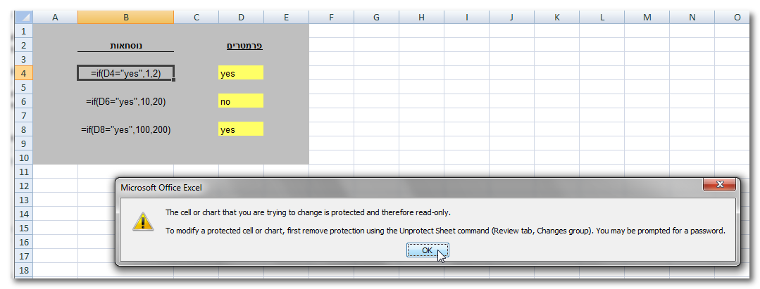 שלב 5: כעת, אחרי נעילת הגיליון, תאי הנוסחאות יהיו חסומים לשינוי, והודעה מתאימה תקפוץ:
