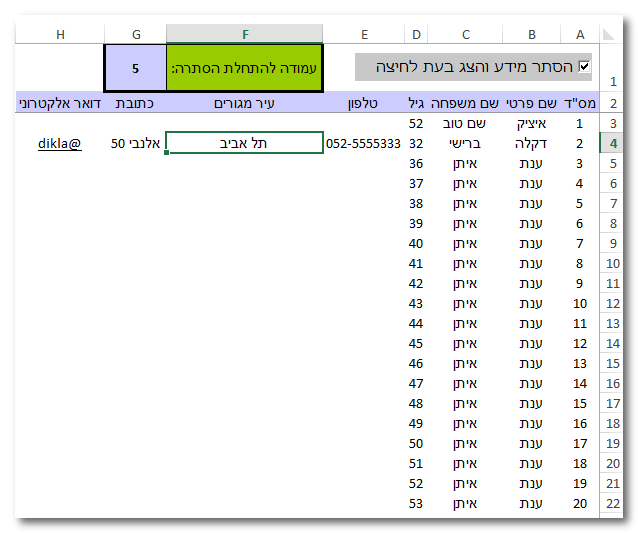 2. ניתן לשנות את העמודה הראשונה אשר תוסתר (לדוג': אם נכתוב בתא את הערך "4", העמודות שיוסתרו הן "D" ושאר העמודות עד סוף הטבלה)