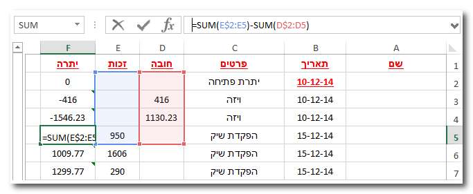 מהי הנוסחה שתחשב את היתרה עם כל שינוי בסכומי החובה והזכות?