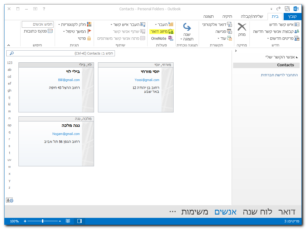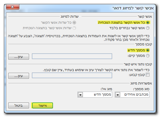 יש לוודא שלכל אנשי הקשר מוגדרים הנתונים הנדרשים ליצירת תבנית ההודעה ולמשלוח הדואר.
