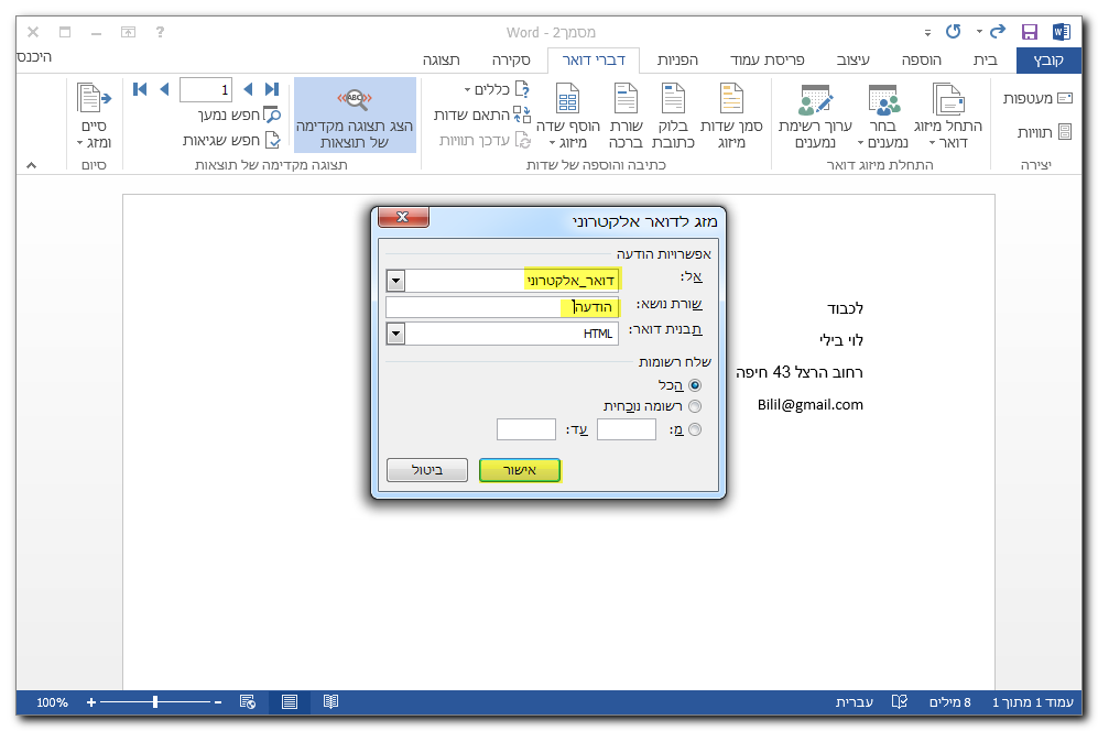 שלב 8 – בבחירה של "שליחה בדואר אלקטרוני" יש להגדיר את השדה שמכיל את כתובת הדואר האלקטרוני (ברשומות אנשי הקשר) ואת נושא ההודעה שתישלח לנמענים.