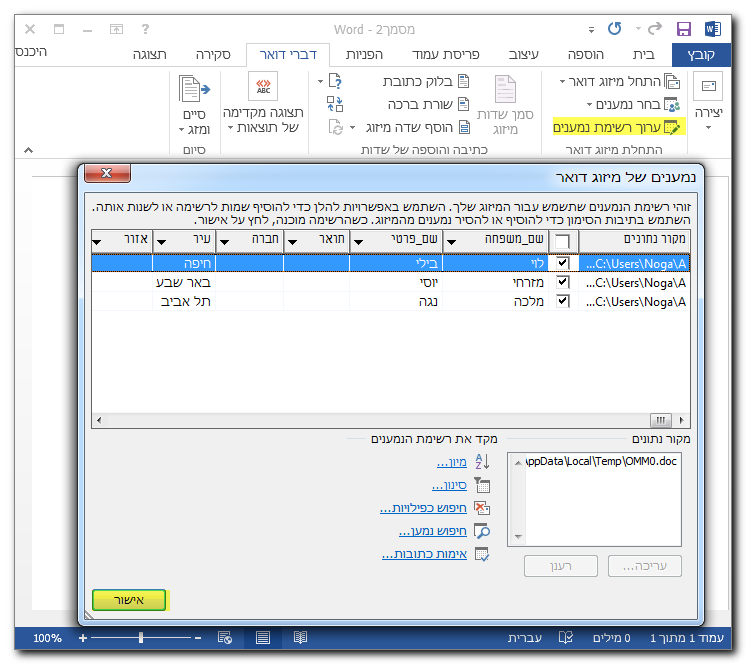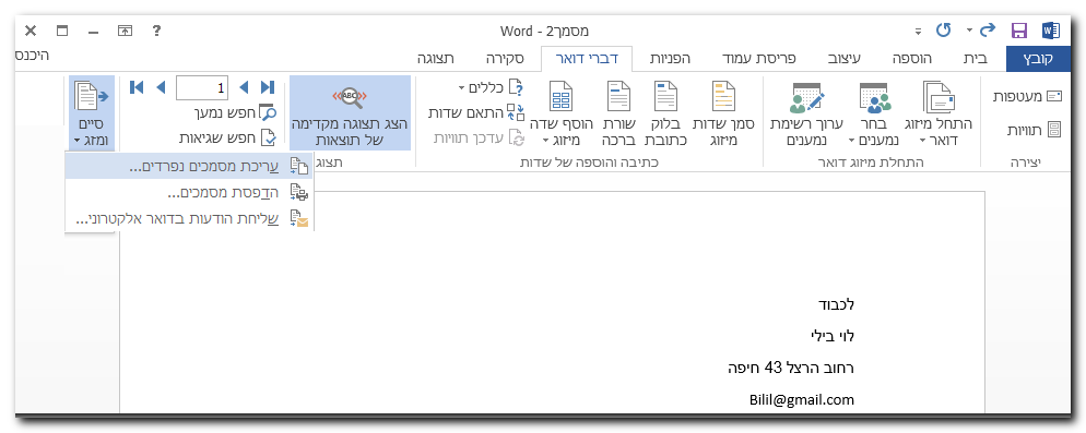 בסיום הגדרת אנשי הקשר או השלמת הפרטים יש ללחוץ על מיזוג דואר.