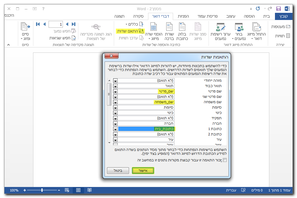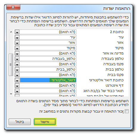 שלב 4 – יש לבחור ב-"התאמת שדות" על מנת לוודא שכל השדות בהם יעשה שימוש מתואמים. מצ"ב מספר דוגמאות.