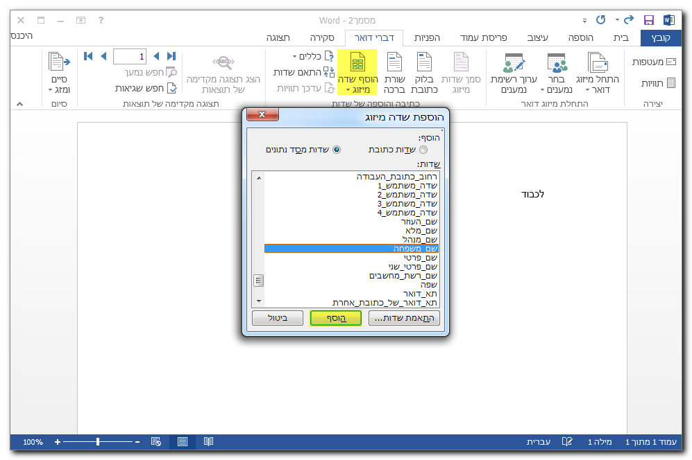 בכל מקום בו נדרש שדה ממוזג יש ללחוץ על "הוסף שדה מיזוג" ולבחור בשדה הנדרש.