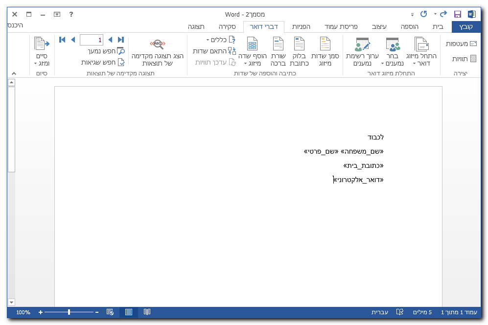 שלב 3 – ייפתח מסמך וורד ריק שישמש להכנת תבנית המייל.