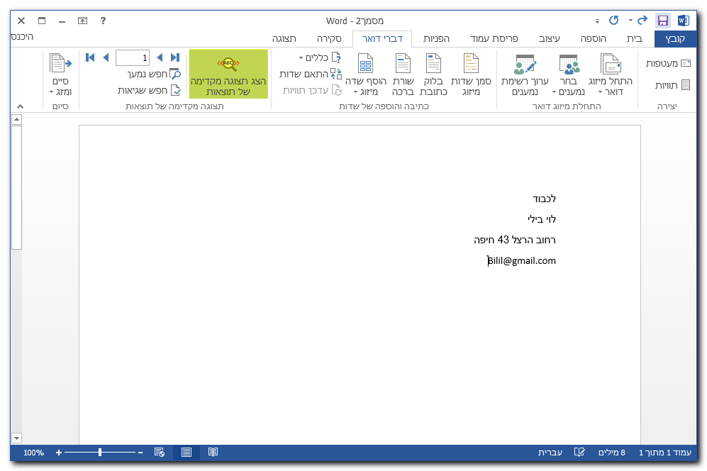 שלב 6 – בלחיצה על "הצג תצוגה מקדימה של תוצאות" יוצגו המסמכים שייווצרו על ידי המיזוג. ניתן לדפדף בין המסמכים על ידי לחיצה על החיצים הכחולים.