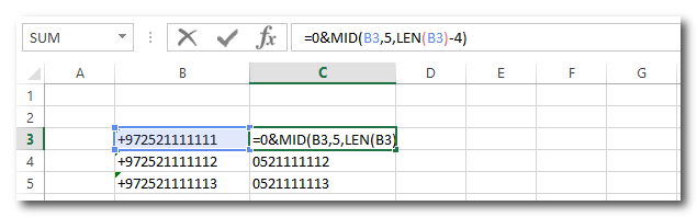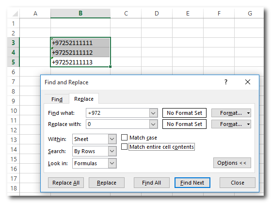 אפשר להשתמש בהחלפת טקסט (CTRL+H) על טווח התאים נבחר, המכיל מספרי טלפון, כאשר +972 יוחלף לאפס (במקרים מסוימים יהיה צורך להשתמש בגרש בודד לפני אפס בצורה הבאה: 0').