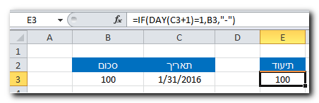 על מנת לענות על מצבים שונים של תאריך סיום חודש (30 לחודש או 31 לחודש), בנוסחה בודקים אם היום הבא יוצא הראשון לחודש, שאם כן - ערך בתא התיעוד מקבל את ערך תא המקור.