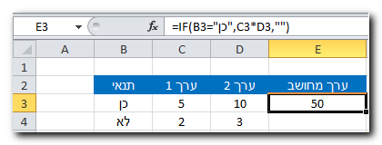 בדוגמא זו אם התנאי מתקיים כלומר תא B3 מכיל את המילה "כן", תתבצע הכפלת מספרים, אחרת התא יישאר ריק (בעזרת גרשיים כפולים).