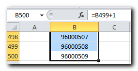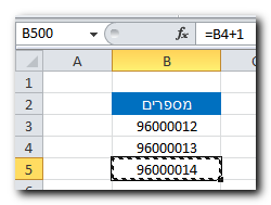 כעת נעתיק את הנוסחה ונדלג לתא שבו נרצה לסיים את המספרים, למשל B500. הקפיצה מתבצעת על ידי הקלדת ערך התא בפינה עליונה שמאלית: