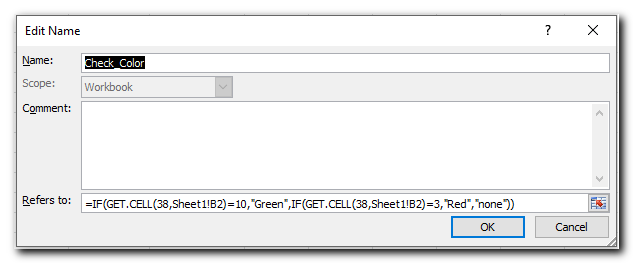 =IF(GET.CELL(38,Sheet1!B2)=10,"Green",IF(GET.CELL(38,Sheet1!B2)=3,"Red","none"))