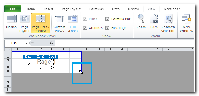 2 - תתקבל תצוגה גרפית של מה שמוגדר להדפסה. במצב זה ניתן למשוך ולשנות את גודל הטווח להדפסה על ידי משיכה מהקו הכחול:
