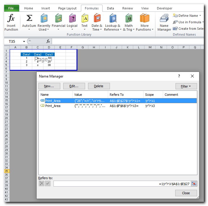 יש מספר אפשרויות לפתרון הבעיה. להלן שתיים מהן, האחת באמצעות הגדלת טווח תאים בגיליון במצב עמודים להדפסה, והשנייה בעזרת הגדרת "נוסחה" בטווח במנהל שמות.