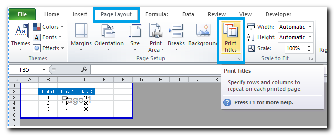 כדי לקבל תצוגה מקדימה להדפסה ניתן לנווט לתפריט פריסת עמוד ולבחור בכותרות הדפסה: