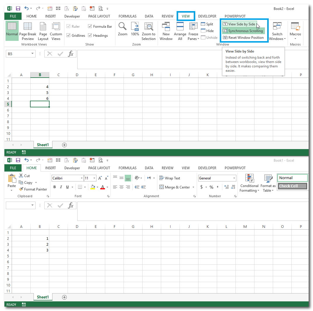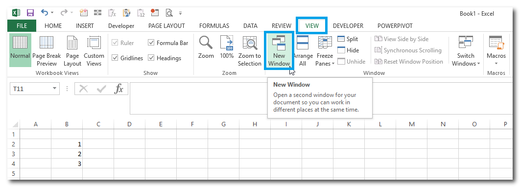 אם רוצים לראות במקביל טבלאות שנמצאות באותו קובץ, ניתן לפני הגדרת התצוגה לפתוח את אותו הקובץ בחלון חדש בהתאם לתמונה הבאה, ולאחר מכן להגדיר את התצוגה המקבילית כמו בתמונה הקודמת: