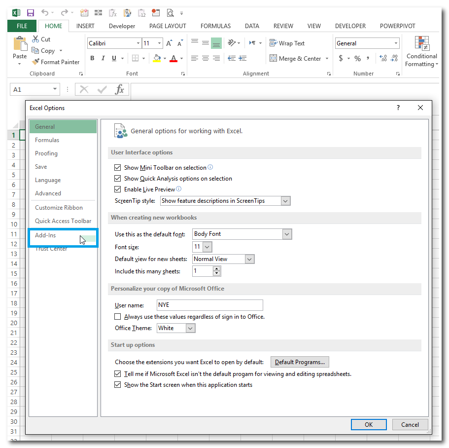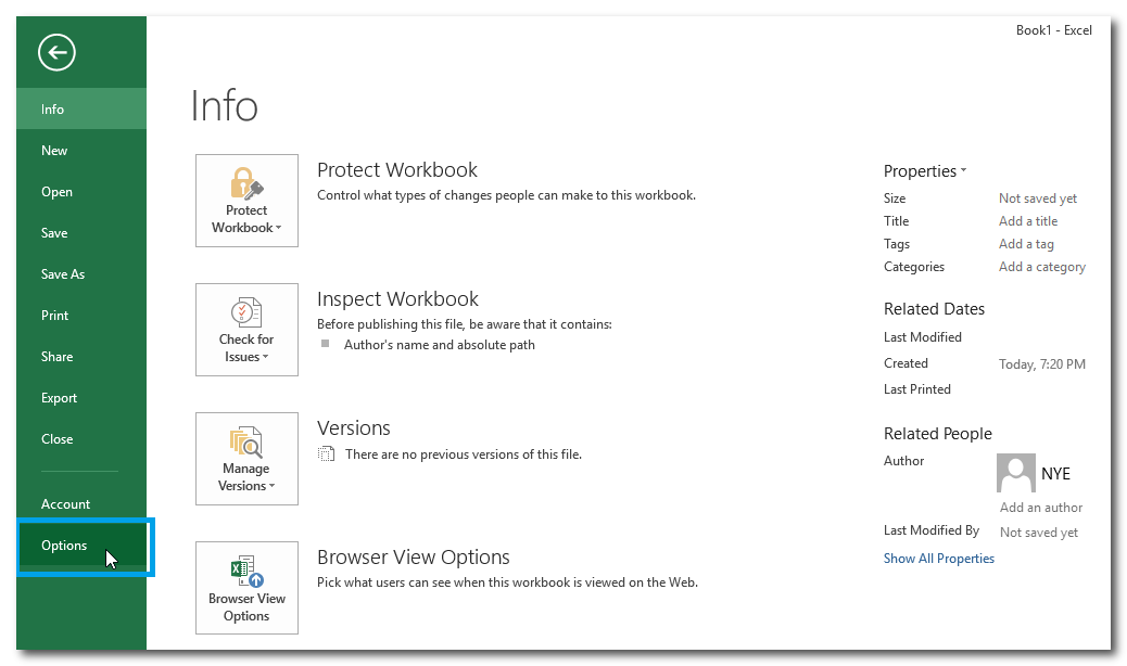 בתפריט "קובץ" הראשי נבחר "אפשרויות":