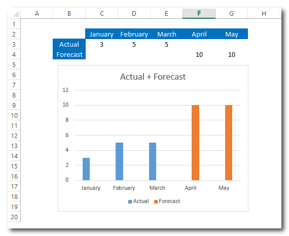 דרך מומלצת להכנת הנתונים בטבלה היא הגדרת נוסחאות כך ששורת "בפועל" תקבל ערכי אפס עבור תקופות עתידיות (בעזרת נוסחת IF), ואילו שורת "תחזית" תוגדר כך שתכיל אפס עבור תקופות העבר.