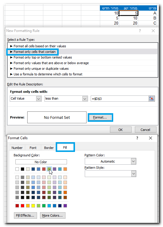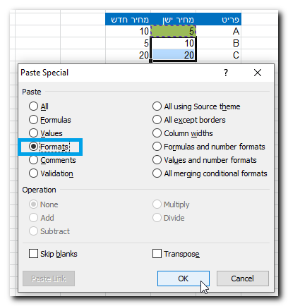 נקח טבלה עם שלוש עמודות ומחירים ישנים וחדשים. נעמוד על תא עם מחיר 5 ונפעיל עיצוב מותנה שבו נגדיר שאם המחיר השין קטן מהמחיר החדש - התא ייצבע בירוק: