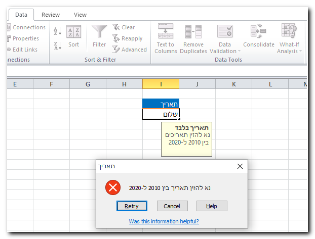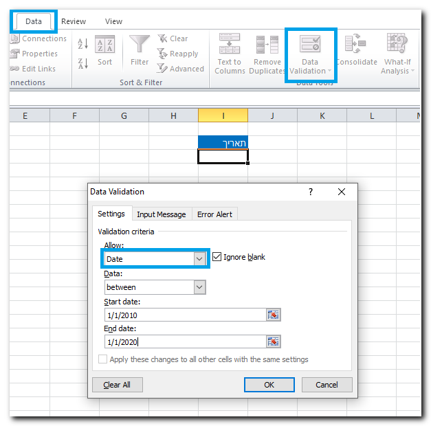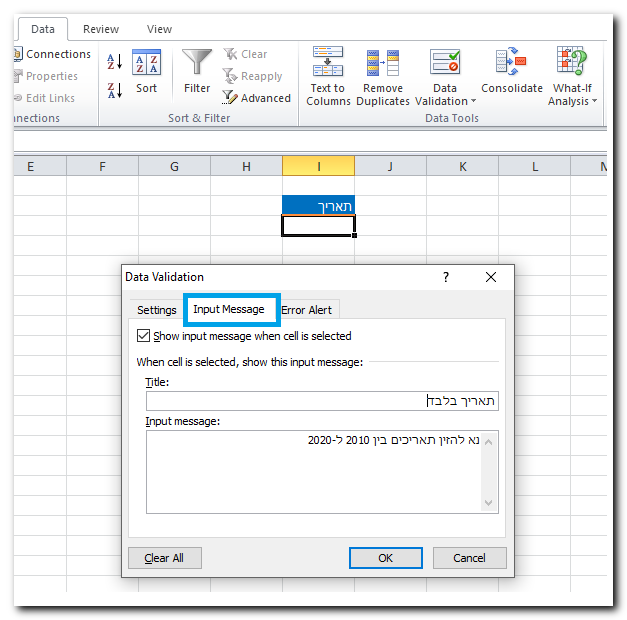 באפשרויות של אימות נתונים ניתן להוסיף הן הודעה מקדימה והן הודעה על תוכן שאינו מתאים.1) נבחר תא או טווח תאים להגדרת אימות נתונים בתפריט נתונים/אימות נתונים. לצורך הדוגמא נגדיר אימות על תאריך בטווח 2010 עד יומה הראשון של שנת 2020: