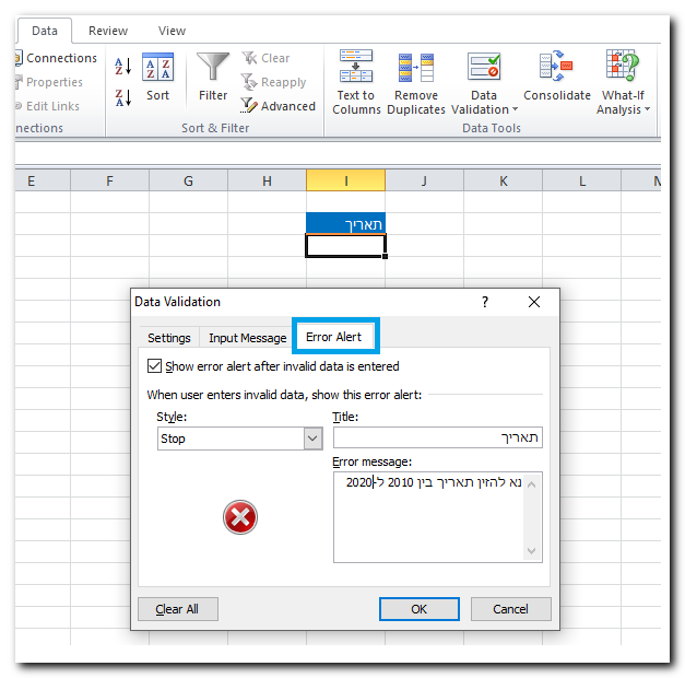 איך ליצור התראת פופ אפ כאשר הזנת הנתון לא תואמת את אימות הנתונים?