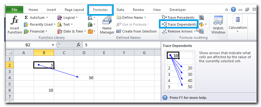 על מנת לראות באילו נוסחאות נעשה שימוש בתא נבחר, ניתן להשתמש באפשרויות מעקב בסרגל נוסחאות.