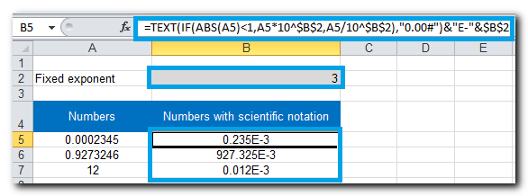 ניתן להציג מספר בצורה מדעית בעזרת עיצוב תאים, אולם אז האקספוננט נקבע על ידי אקסל:על מנת להציג מספר עם אקספוננט קבוע ניתן להשתמש בנוסחה - להלן הדוגמא: