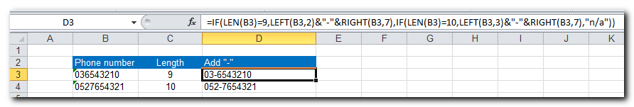 =IF(LEN(B3)=9,LEFT(B3,2)&"-"&RIGHT(B3,7),IF(LEN(B3)=10,LEFT(B3,3)&"-"&RIGHT(B3,7),"n/a"))