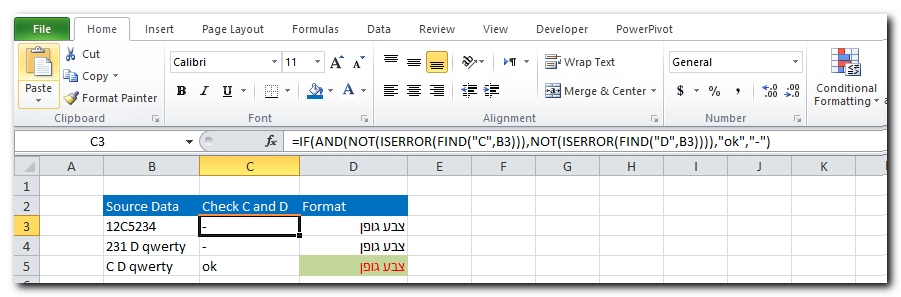 =IF(AND(NOT(ISERROR(FIND("C",B3))),NOT(ISERROR(FIND("D",B3)))),"ok","-")