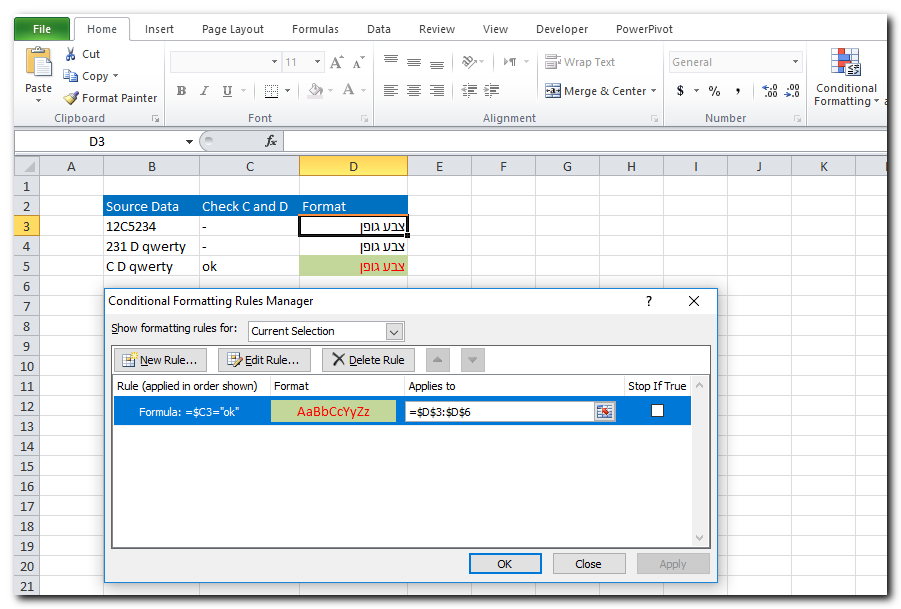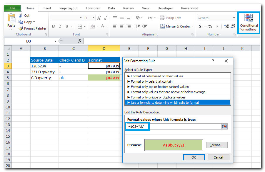 2) כעת, נרצה שתאים בעמודה שלישית יגיבו בעיצוב מותנה על בדיקה מסעיף 1. נגדיר עיצוב מותנה על תא בעמודה של תנאי. יש לשים לב שבהגדרת תנאי על תא C3 יש קיבוע רק על עמודה (קיבוע בעזרת סימן $). לפי הצורך, ניתן להעתיק את העיצוב לתאים שבאותה עמודה.