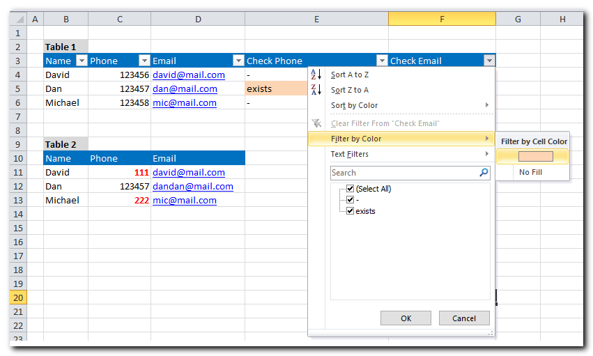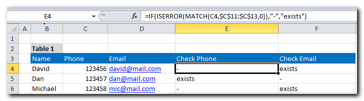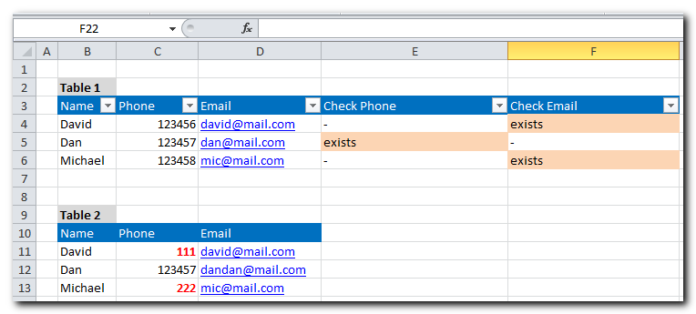 1) נניח שיש שתי טבלאות (לצורך הפשטות באותו גיליון). נוסיף שתי עמודות עזר לחיפוש טלפון וחיפוש אימייל בטבלה השנייה. אותו תהליך לגבי אימייל.
