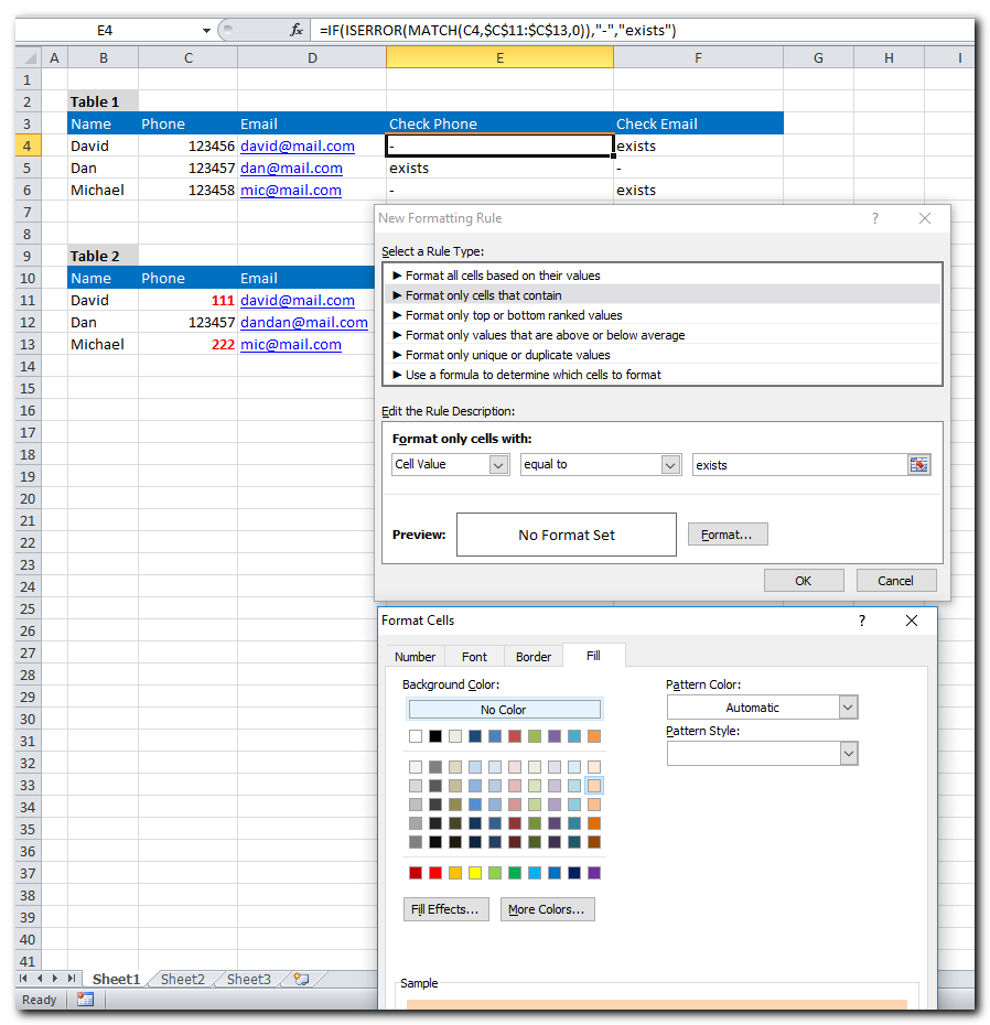 יש לי שני גליונות אקסל, בכל אחד מהם שורות עם נתוני שם, טלפון, אימייל וכו'. הייתי רוצה לצבוע את השורות בהן יש אימייל או טלפון זהה בשני הקבצים.