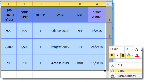 1) בקובץ האקסל הראשון - יש לסמן את השורות שנדרש להעתיק ולבחור ב-"העתק" (לחצן ימני בעכבר).
