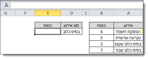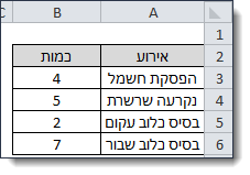 1. בגיליון אקסל בעמודה A נגדיר שמות אירועים ובעמודה B נגדיר את הכמות שלהם.