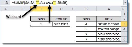 על מנת לסכום את המספרים לפי חלק מהטקסט יש להשתמש בתו כוכבית * שהינו מסוג Excel wildcard ומשמעותו טקסט באורך כשלהוא.