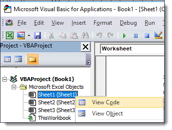 2. נפתח את עורך VBA של אקסל על ידי לחיצה על Alt+F11, נסמן את שם הגיליון Sheet1, נלחץ על לחצן ימני בעכבר ונבחר View Code.