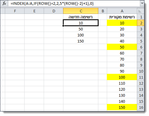 2. בעמודה C נחשב את הרשימה החדשה כך שיוצגו הערכים הראשון, החמישי, העשירי וכך הלאה מהרשימה המקורית.