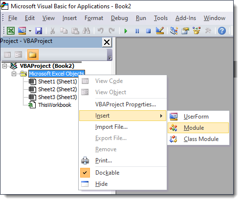 2. נפתח את עורך VBA על ידי לחיצה על Alt+F11. בצד ימין נסמל את Microsoft Excel Objects מתחת לשם קובץ האקסל, נלחץ לחצן ימני ונבחר Insert ו-Module.